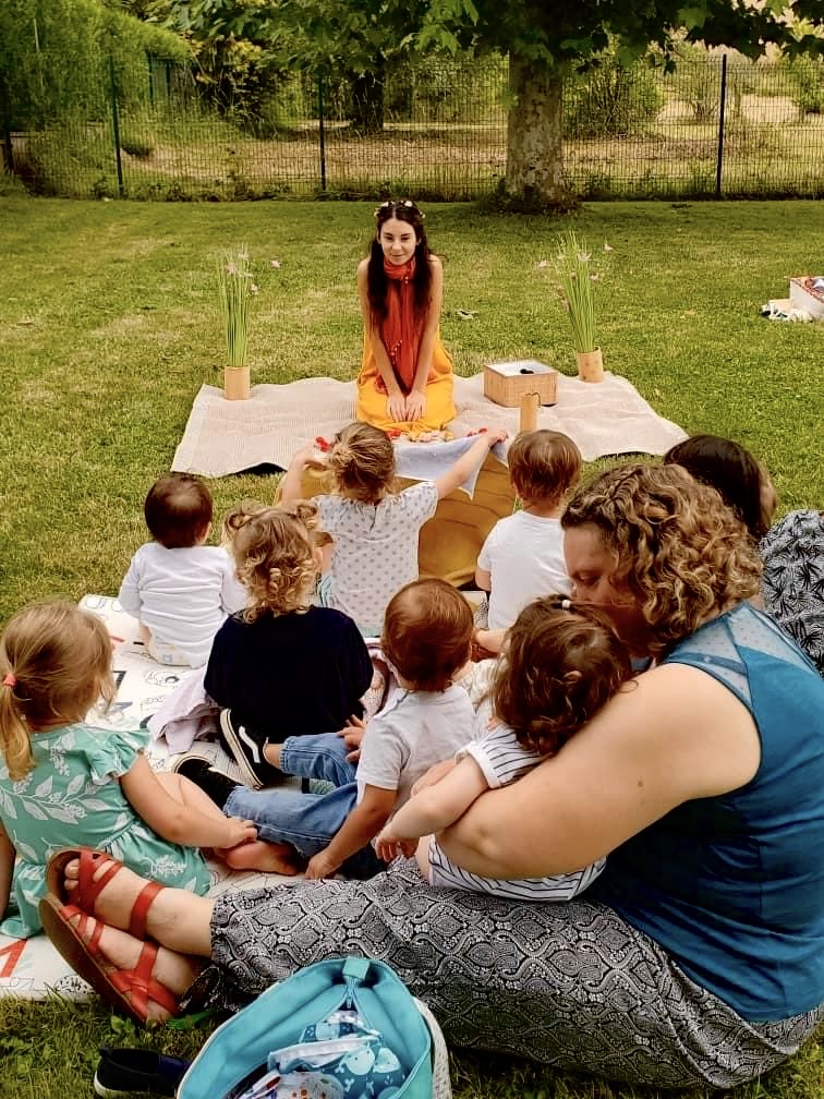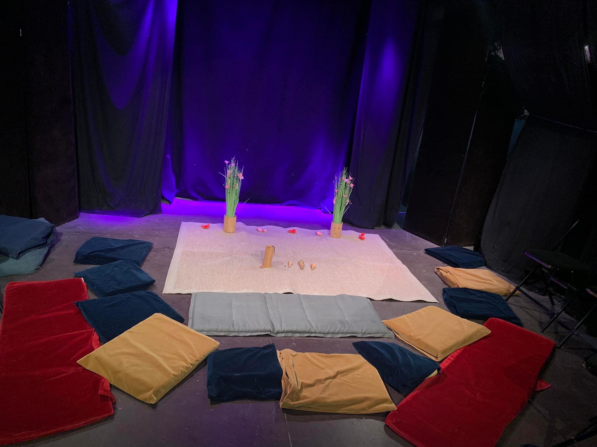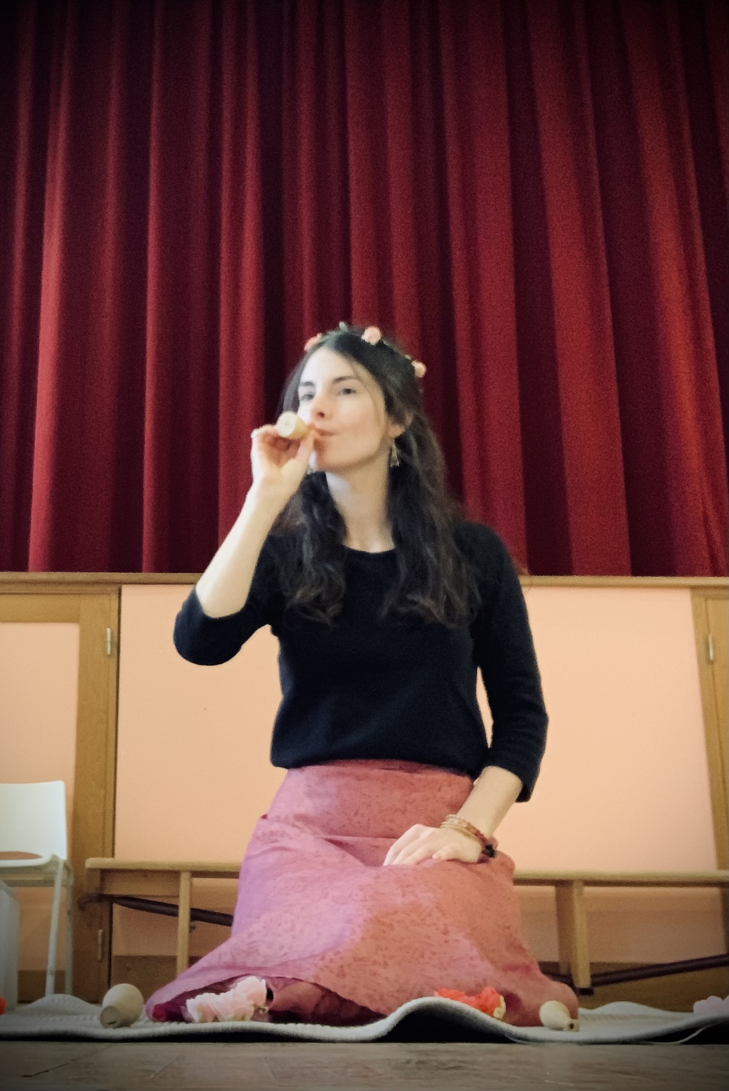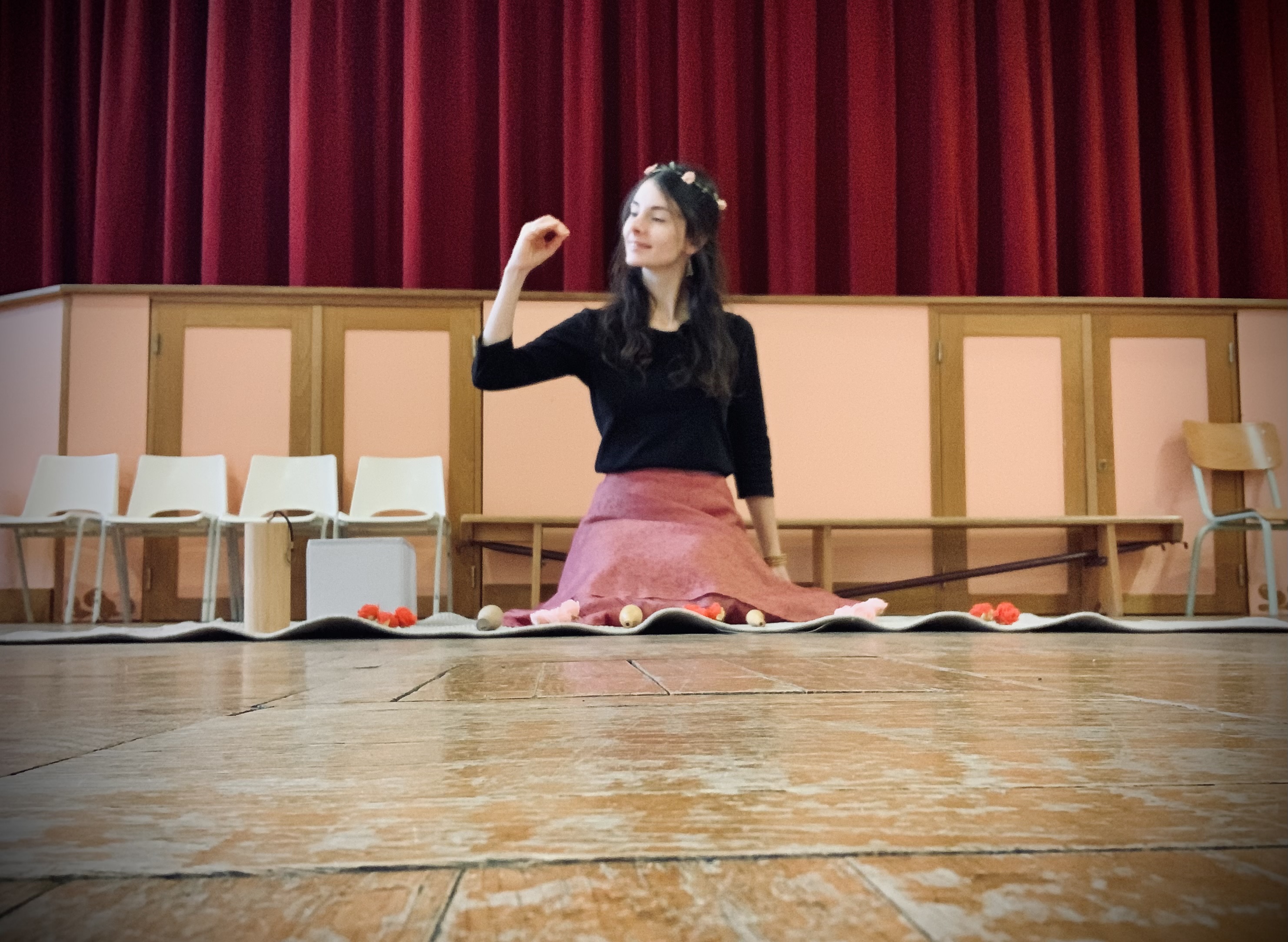 Mise en place: le décor est facilement transportable et minimaliste pour permettre de conter dans les crèches et autres structures, près du public. J’ai seulement besoin d’un espace de 2m / 1,50m pour installer mon tapis, mes fleurs, et mes petits instruments. S’adapte aussi à la scène et à l’extérieur.