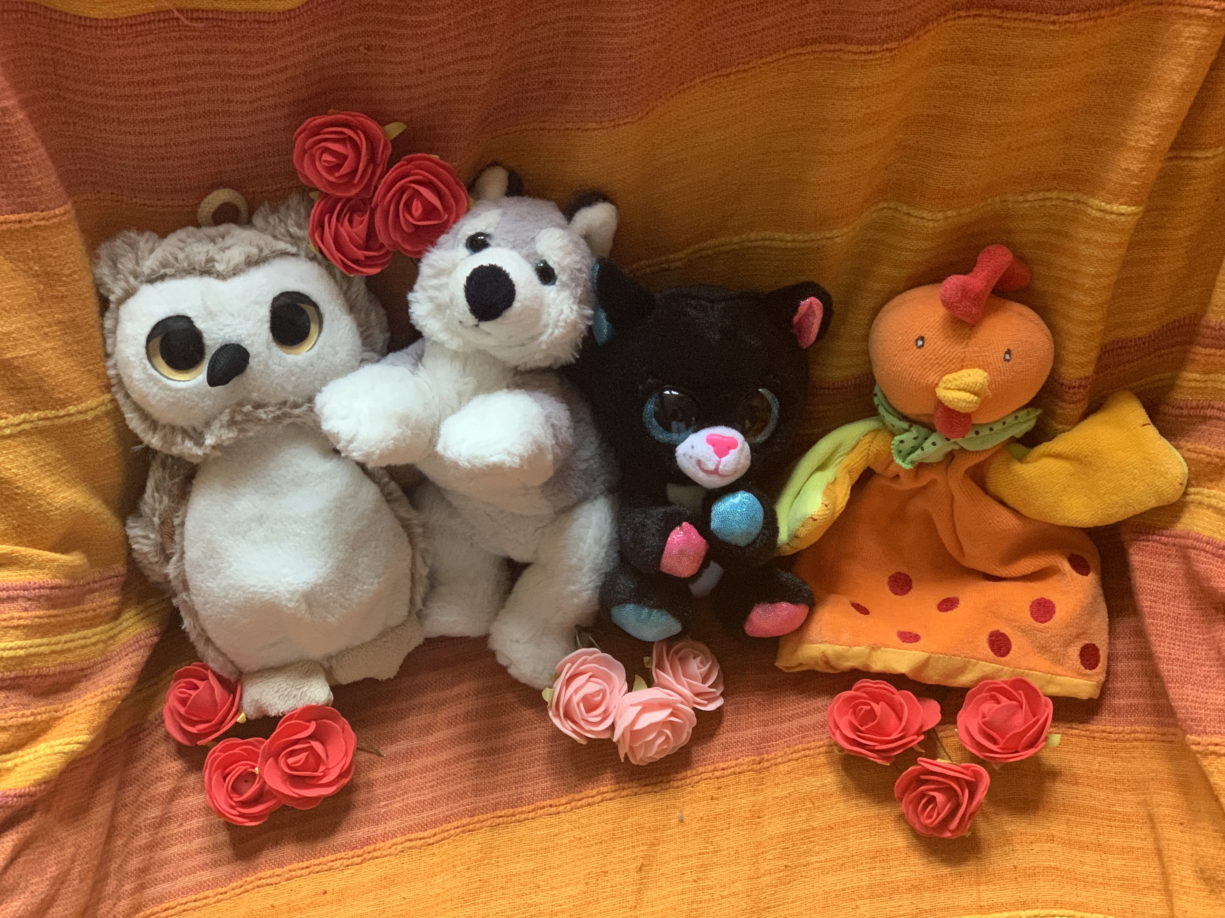 - Peluches: hibou, loup, chat, poule